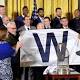President Barack Obama holds up a "W" flag, like the one flown over Wrigley Field in Chicago after Cubs wins, with manager Joe Maddon and club co-owner Laura Ricketts, surrounded by members of the reigning World Series champion team at a January ...